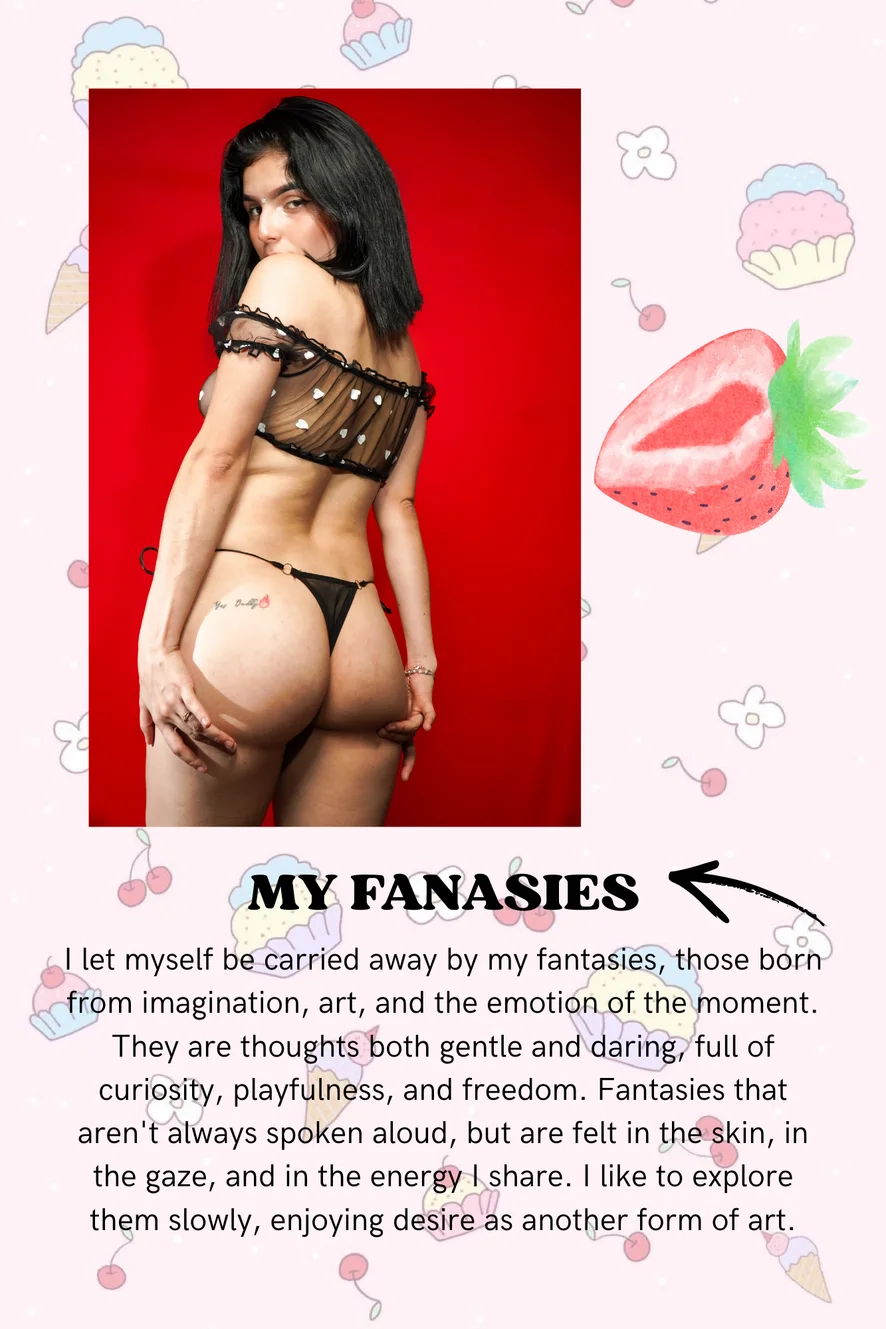 I let myself be carried away by my fantasies, those born from imagination, art, and the emotion of the moment. They are thoughts both gentle and daring, full of curiosity, playfulness, and freedom. Fantasies that aren't always spoken aloud, but are felt in the skin, in the gaze, and in the energy I share. I like to explore them slowly, enjoying desire as another form of art.