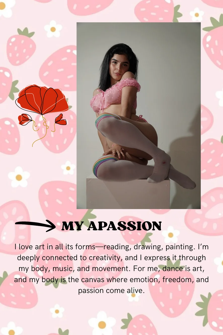 I love art in all its forms—reading, drawing, painting. I’m deeply connected to creativity, and I express it through my body, music, and movement. For me, dance is art, and my body is the canvas where emotion, freedom, and passion come alive.
